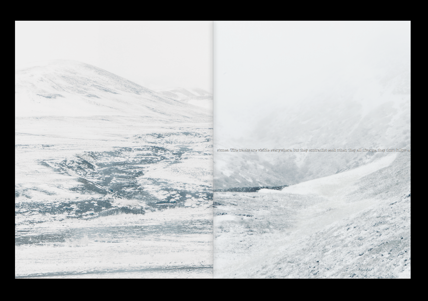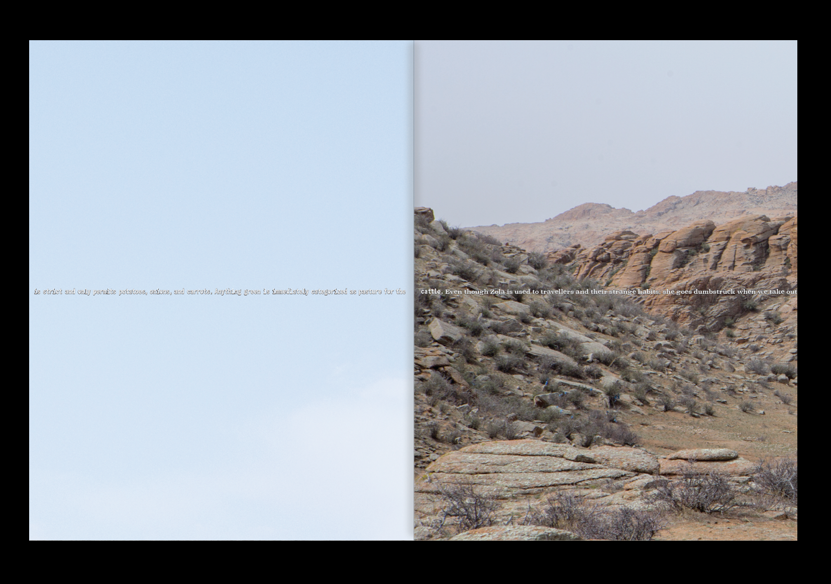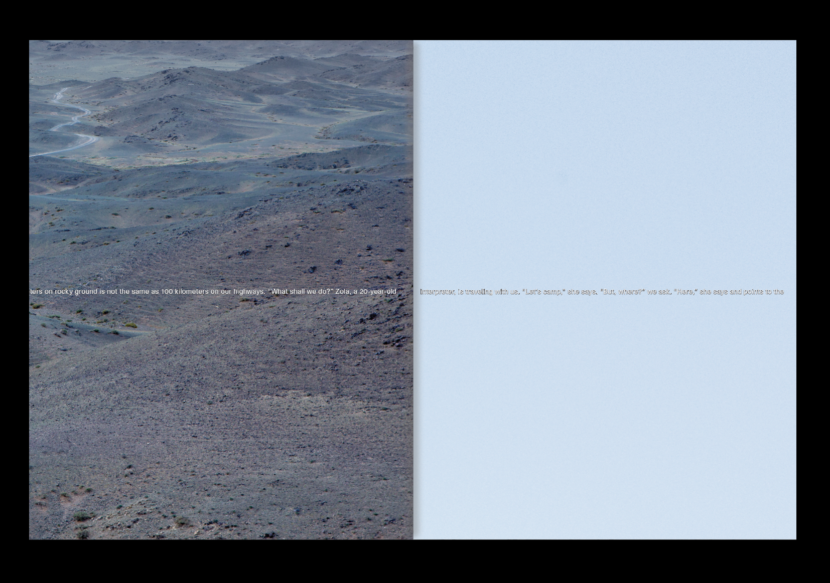 This 130 pages book is about a journey through Mongolia by photographer Ilan Weiss. The book is made in a way that it displays an ongoing horizon of the various landscapes of the travel. The images have an infinite feeling being printed over the edges and on the inside of the French fold. The cover is an unfold-able image-wrap showing the crossing point where the journey comes together and where it continues to go in different ways again.